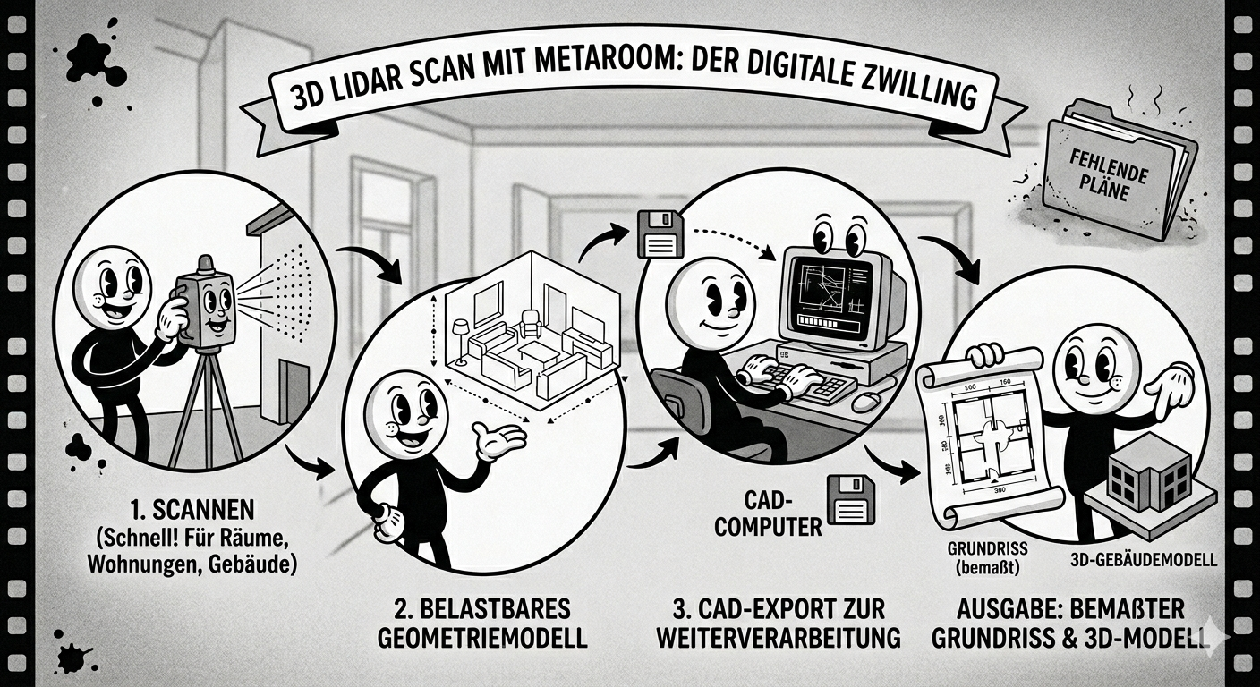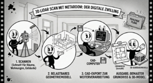 Statt längeren Aufmaßzeiten setzen wir den „Metaroom-Scan“ ein – dieser liefert in kürzerer Zeit ein belastbares Geometriemodell – welches